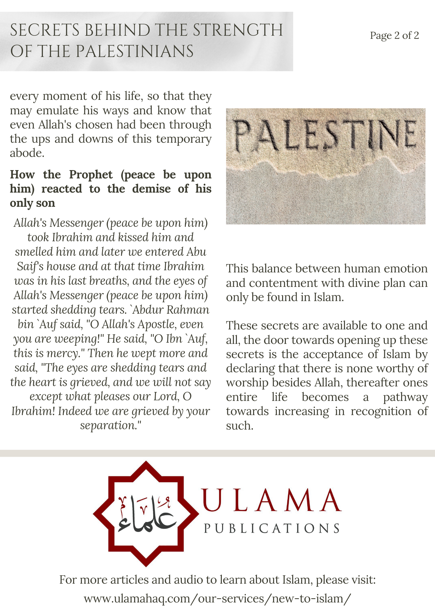 The secret behind the strength of the Palestinans in the face of losing the apples of their eyes, facing loss of the homes that once provided warmth and safety for them, which have now turned into concrete graves, and essentials which are necessary for mere existence, is a secret hidden within Islam itself.